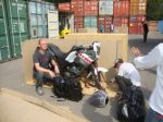 The drive to the shippers was manic they drive like lunatics. Arrived at shippers and waited two hours why? No one knows. The a manic unpack and rebuild of the bike with the shipper saying faster faster we close in 1 houryou carry you bike out to the car park we close. So with crap everywhere in the car park we start to sort gear.
