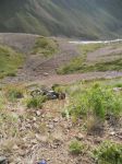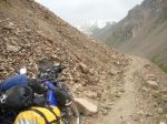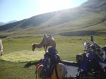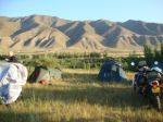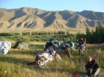 The trail got progressively more challenging went from dust/grass to rock and rubble getting very narrow only 12 wide in a few places the Drz just ate it up even fully loaded but the KTM, Trans Alp, Tenere and the Aftica twin was making hard work of it. I got so far ahead I had to wait 30 minutes for them to catch up.We managed to get to 3100mts when Chris on the Trans Alp lost control and went over the edge 45 and fell about 15 to 20 feet, he was very lucky to get away uninjured. There was no chance of getting the bike back up to the trail. It was late afternoon and the temperature at night was below freezing and we were 80 miles from a main road. We has seen a battered pickup an hour back next to a yurt at the river crossing so it was decided the two would stay and three would ride for help. We were all starting to suffer with the altitude I was feeling dizzy and had a headache all the others looked rough I did not think I could get there and back fully loaded so dumped all my kit and went for help with Jan and Ad. By the time we got back to the river the van had left and might be back in the morning. The mountain snow had been melting all day and the river was over 4 foot and very fast impossible to cross until the river lowered. No choice but to pitch up and wait until the morning. Freezing night I had all my clothes on and still cold. There was frost on the bikes in the morning, Martin and Chris had to tough it out 800 mts higher so at least 8 degrees colder possibly -6 but there was sod all we could do about it until the morning.