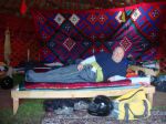 While having dinner in the hosts yurt a old pile of bedding began to moan and it was our hosts father who was very ill, with heart problems. Between use we have a variety of prescription drugs painkillers, antibiotics ect. We offered them all but they refused and said that maybe he goes to hospital tomorrow or maybe the next day. The hospital was at Biskek about 300kl away. I did seem that he either got better and got up, or he stayed there and died. The host seemed accepting of this situation. By our standards it seemed harsh but the Kyrgys seemed pragmatic about it. It put a dampener on the evening.