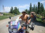 Teamed up with 3 Dutch riders Ad, Martin and Jan. A dangerous ride out of Almaty and finally into the quieter country roads an hour out of Almaty and looked for somewhere to stay found a hotel with no guests other than Jan, Martin, Ad and myself. The owner got the staff to let us have some leftovers, horse, bread and Vodka.