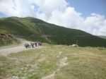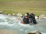 The trail got progressively more challenging went from dust/grass to rock and rubble getting very narrow only 12 wide in a few places the Drz just ate it up even fully loaded but the KTM, Trans Alp, Tenere and the Aftica twin was making hard work of it. I got so far ahead I had to wait 30 minutes for them to catch up.We managed to get to 3100mts when Chris on the Trans Alp lost control and went over the edge 45 and fell about 15 to 20 feet, he was very lucky to get away uninjured. There was no chance of getting the bike back up to the trail. It was late afternoon and the temperature at night was below freezing and we were 80 miles from a main road. We has seen a battered pickup an hour back next to a yurt at the river crossing so it was decided the two would stay and three would ride for help. We were all starting to suffer with the altitude I was feeling dizzy and had a headache all the others looked rough I did not think I could get there and back fully loaded so dumped all my kit and went for help with Jan and Ad. By the time we got back to the river the van had left and might be back in the morning. The mountain snow had been melting all day and the river was over 4 foot and very fast impossible to cross until the river lowered. No choice but to pitch up and wait until the morning. Freezing night I had all my clothes on and still cold. There was frost on the bikes in the morning, Martin and Chris had to tough it out 800 mts higher so at least 8 degrees colder possibly -6 but there was sod all we could do about it until the morning.