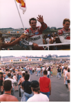 Here is McKenzie on the parade lap after the '89 race with Wayne Rainey. You can also see a good old fashion Donnington post race track invasion which tended to start as soon as the race was finished. Thousands of people on the track dodging 500cc GP bikes. Those were the fun pre H & S days!