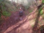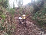 Mike seemed a pretty perky kind of chap, pitching up on a 200cc KTM two stroker and obviously very enthusiastic. It is generally considered that Newcastle supporters are consider hard core, stripped to the waste in the middle of winter stoically watching another trophyless season, however, trail riders are also made of some pretty stern stuff as Mike pitched up in a shirt and motocross top and jeans! Still being an ex-marine, I guess putting your body through various forms of pain is considered routine and riding Devon lanes in mid winter armed with only a couple of millimetres of denim is going to hurt.... We set off up the lane, relatively routine in summer, but it runs down to the bottom of the hill and the depression fills with water over winter and so we gave the bikes and Mikes jeans a goodsoaking from the off. Mike's other bike is some mentalist Kwacker with about 5 times the power of my Serow and he's not ridden off road for over a decade, but he was pretty competent partly owing to the large amount of off road mountain bike riding he does, so his balance is fine, it's just the fine throttle control that needs refinement. We rode up through Cotton Farm, Way Village and down through Grantland which include a bit of a ride along a very swollen stream with the usual slippery stones ensuring maximum concentration is required to avoid a dunking. I rode through first and sparked up the video eagerly awaiting my victim to follow through. Mike had already showed that falling off held no fear to him and his jeans were still remarkably dry. He cleaned the stream without a hint of a wobble - bugger! Paul followed and but for a tiny wobble also failed to provide the £250 YBF moment.