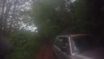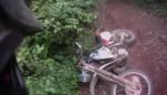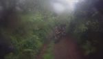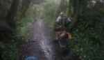 My goggles were so steamed up going down 074 that steering was more an act of faith than choice, and vision was restored in time for the blind exit from 073. Simon almost followed the new tarmac into the field next to the misleading home made Footpath/Bridleway sign pointing to 081, but made short work of the red mud splash before the rocky branch strewn climb. We zigzagged down 094, paused on 105 for a dog walker waiting for his elderly lurcher, and romped down 106. The forecast rain arrived and the Contour went into its waterproof box on 125 where the red puddles were unusually shallow. The repairs on 134 and 334 are less tidy these days and many large rocks have escaped to make the bowl shaped lanes more interesting, and the stream down the middle of the lane near the mid point brings out the schoolboy wanting to make a splash. Deep sided ruts on 155, but no mud to speak of. The puppy the sign on 156 tells of must be getting on by now. For a road not on the map C-074 sure has a lot of tyre tracks, and we turned left at the crossroads climbing over the hill on 160. Skipping the ford we corkscrewed up the hill on 164, 428 & 310. Slithering down 435 past the new landslide we spun the mud from our tyres before the stream on 166 washed them. Keeping both wheels in the same rut as we climbed 187 we began descending 201 after the gate. Simon suddenly turned sideways on some slippery slate and drove into the hedge for a closer look, and struggled to extract the bike from the overhanging greenery while I struggled to smother the laughter.