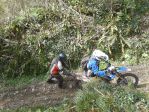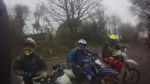 Wheely saved us a great deal of hassle by pointing out the clash between our proposed itinerary and the Devon Dirt route and in order not to meet several hundred muddy mountain bikers we headed south instead. After a false start caused by a flat battery requiring a running bump start for Fred's huge Husaberg we headed along Pigeon lane. The guinea fowl were in their paddock but may often be seen running around the bottom end of Woodpark lane. The arm less windmill stands at one end of it's namesake lane, and Compton Mill's pool is just around the corner from it's own. Red mud churned to gloop fills an unusually deep wallow on Windthorn lane and Fred bravely (?) chose this spot for the first test of his electric starter since the bump start, a good thing it started.