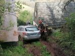 Back down Forches Hill into Stokeinteignhead we then rode back up one of the lanes we'd recently come down taking us to Ridge road (a snotty and muddy lane) then back down to lower Rocombe farm. Turning into our first lane at No Mans Land we headed up the hillside negotiating the loose rocks and low trees this lane has to offer - a good challenge this one. At the top we tracked along the main road and turned into the next lane where we met a sheep farmer who was moving his flock between fields. This presented a perfect opportunity for a snack break. Sheep secured and quad bike moved out of the way we descend back towards Lower Rocombe Farm. The next lane needed Russ's trusty SILKY folding handsaw as there was a tree down blocking our way. That was quickly removed - well, the smaller part of the tree but enough to allow us to pass - then back up the hillside and out of one lane immediately into another. A very short road stint and we hung a right into the next lane which would have taken us into Higher Charlecombe Farm but there was a large tree down across the lane making it impossible to pass. At this juncture Russ remembered this lane being mentioned recently at one of the TRF monthly meets. The landowner with the orchard on the other side of the hedge to the lane is quite happy not to get the tree removed as he's far from biker friendly and if the fallen tree prevents bikers riding the lane then that's all good for him. We headed back up the lane - which was a nice slip-slidey challenge - then continued to the northern exit of the lane which is the steep descent next to the house but this was made harder due to an abandoned car which was obstructing the lane. Likely stolen, driven down the lane to the point of no return and seemingly no possibility of extraction from it's resting location. Good luck to whoever has to try and get that car out!