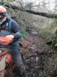 Back down Forches Hill into Stokeinteignhead we then rode back up one of the lanes we'd recently come down taking us to Ridge road (a snotty and muddy lane) then back down to lower Rocombe farm. Turning into our first lane at No Mans Land we headed up the hillside negotiating the loose rocks and low trees this lane has to offer - a good challenge this one. At the top we tracked along the main road and turned into the next lane where we met a sheep farmer who was moving his flock between fields. This presented a perfect opportunity for a snack break. Sheep secured and quad bike moved out of the way we descend back towards Lower Rocombe Farm. The next lane needed Russ's trusty SILKY folding handsaw as there was a tree down blocking our way. That was quickly removed - well, the smaller part of the tree but enough to allow us to pass - then back up the hillside and out of one lane immediately into another. A very short road stint and we hung a right into the next lane which would have taken us into Higher Charlecombe Farm but there was a large tree down across the lane making it impossible to pass. At this juncture Russ remembered this lane being mentioned recently at one of the TRF monthly meets. The landowner with the orchard on the other side of the hedge to the lane is quite happy not to get the tree removed as he's far from biker friendly and if the fallen tree prevents bikers riding the lane then that's all good for him. We headed back up the lane - which was a nice slip-slidey challenge - then continued to the northern exit of the lane which is the steep descent next to the house but this was made harder due to an abandoned car which was obstructing the lane. Likely stolen, driven down the lane to the point of no return and seemingly no possibility of extraction from it's resting location. Good luck to whoever has to try and get that car out!
