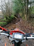 Heading NE out of South Molton our first lane was a lovely long lane (180-089) taking us to North Molton. We looped around the lanes at Heasley, 180-068 and 180-065 which had a little river splash before a slippery climb across a field to the farm. At Flitton Barton (180-080) there had been some tree work and the lane was completely blocked from 10meters in so we had to ride around. As we waited for the oncoming traffic to pass before we turned off the A399 into the woods on 180-076 the driver and female passenger of a Ford Mondeo seemed very excited to see us as they were waving at us in a crazy fashion. Maybe they thought we were someone they knew .or maybe there were just keen bikers. Who knows, but it made us all giggle in bemusement. At the first switch-back at the top of this lane we briefly stopped and Russ recounted that wed also stopped here all those years ago as we had to turn back due to a fallen tree that was impassable. I had the exact same recollection. Onwards passed Hunstone to Walscott then down a fabulous and gnarly lane to Newtown Bridge. I remembered this lane from back along as it was very distinctive - bedrock with large rocky crags and lots of flowing water which made the rocks really slippery. A great challenge of bike control. At the bottom and over the small bridge before turning up into the woods on 180-063, Barton Lane which also had a lot of exposed bedrock. Momentum was key here but both Russ and Damian got caught out resulting in a tricky and very steep hill start. Still, we all made it to the top. Onwards to Haxton Down Lane (180-046 and 045) then a lovely stoney climb through the woods on 180-028. As we approached Loxhore and 180-200 our luck ran out with the weather and we had our first rain shower of the day but it was short lived.
