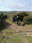 At Clapper Bridge Russ turned off the road to ride the water splash but there was a tree down preventing the usual fun, Boooo. Next up was North Bovey Ford (191-069) so I took the lead into the lane to get into filming position on the opposite riverbank. As I approached the river crossing there were two horses ahead but they just went out of sight as I arrived, perfect. No misdemeanours at the river crossing, thankfully. 191-068 at Langdon overlooking Bovey Castle was next, a great lane this is lined with gorse hedges and stone walls towards the southern end. Contiuning north we headed towards Gidleigh then the lovely lane at Throwleigh (191-053) which is a muddy lane but still inspires confidence to press on keep your feet up. Continuing north we did Beaconpark Lane (191-049) off the main road which starts as muddy ruts but then heads downhill under the enclosed tree canopy. Terry had another very slow tumble here as the bike got a bit cross-rutted in the mud. Had he have had longer legs he would have saved it.