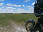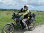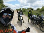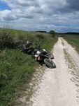 We briefly rode on the A303 to get us to Solstice park then hit Bulford and continued to Larkhill where the route was to take us in the byways directly past Stonehenge but due to the summer solstice and the hippies we hit a Road Closed sign so had to detour significantly around this area and rejoin our route at Berwick St. James. Here again these were wide open, white gravel trails with lots of potholes and whoops. I let Russ ride the T7 for a while here so he could have a go ..... I think he liked it.