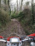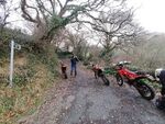 Pridhamsleigh was next which always spooks me with its off-chamber start to this lane - I don't like riding the higher line on the left but riding the low line on the right I feel like I could easily end up in the bushes and the field below. Onwards to Parkfield then Forder Green where we met our first horse of the day. Engines off, a brief pleasant exchange, then we both went on our merry way. We skirted Broadhempston heading towards Parsonage Lane - a hard-packed fast downhill with good visibility - which dropped us to the bottom of Tally Ho. Ascending Tally Ho we met a dog walker near the top so again killed the engines to allow her past with another friendly exchange. Onwards to the quadruple cross-over lanes at Red Post where we stopped in the centre crossroads for a chat and a choccy bar cos my stomach was rumbling!! Exiting south on the steep and rocky decent into Littlehempston the lane onto the main road was slippery as always but has 4-wheeled vehicle tracks in it which I'd never seen before.